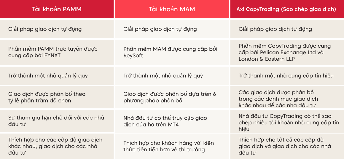 Là một nhà quản lý quỹ PAMM, bạn đóng vai trò then chốt trong hành trình đầu tư của khách hàng. Axi cung cấp cho bạn quyền truy cập vào các giải pháp phần mềm chuyên nghiệp PAMM và MAM được tùy chỉnh để quản lý nhiều chiến lược giao dịch trong môi trường trực tiếp. Phát triển theo tốc độ của riêng bạn với Tài khoản Master PAMM Công khai hoặc Riêng tư. Thu phí hiệu suất và biến đam mê của bạn thành lợi nhuận.