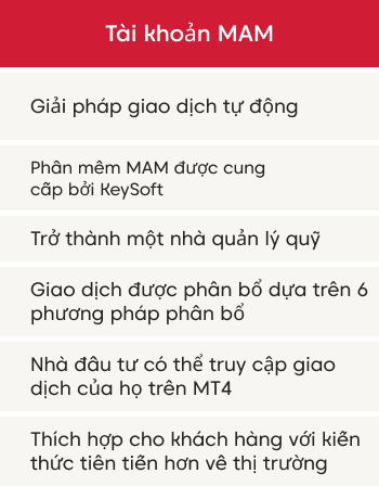 Sử dụng Tài khoản Chính của riêng bạn để quản lý số lượng tài khoản không giới hạn. Thiết lập phí quản lý và hiệu suất làm việc cho bạn. Không cần thiết phải tạo ra một quỹ đầu tư.