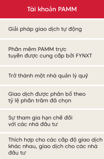 PAMM (Mô-đun Quản lý Phân bổ Phần trăm) là một phương pháp giao dịch tự động phổ biến, cho phép các nhà quản lý quỹ quản lý nhiều tài khoản từ Tài khoản Chính của chính họ. Các nhà quản lý tài khoản PAMM phân phối các giao dịch dựa trên tỷ lệ phần trăm mà họ chọn. Mỗi khi một nhà quản lý quỹ tạo ra lợi nhuận, các nhà đầu tư đăng ký sẽ trả một khoản phí.